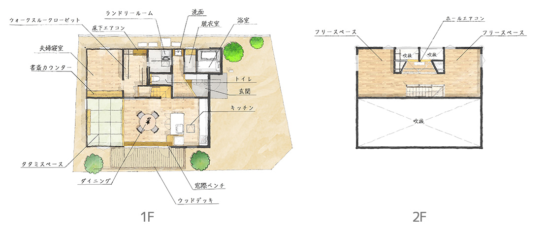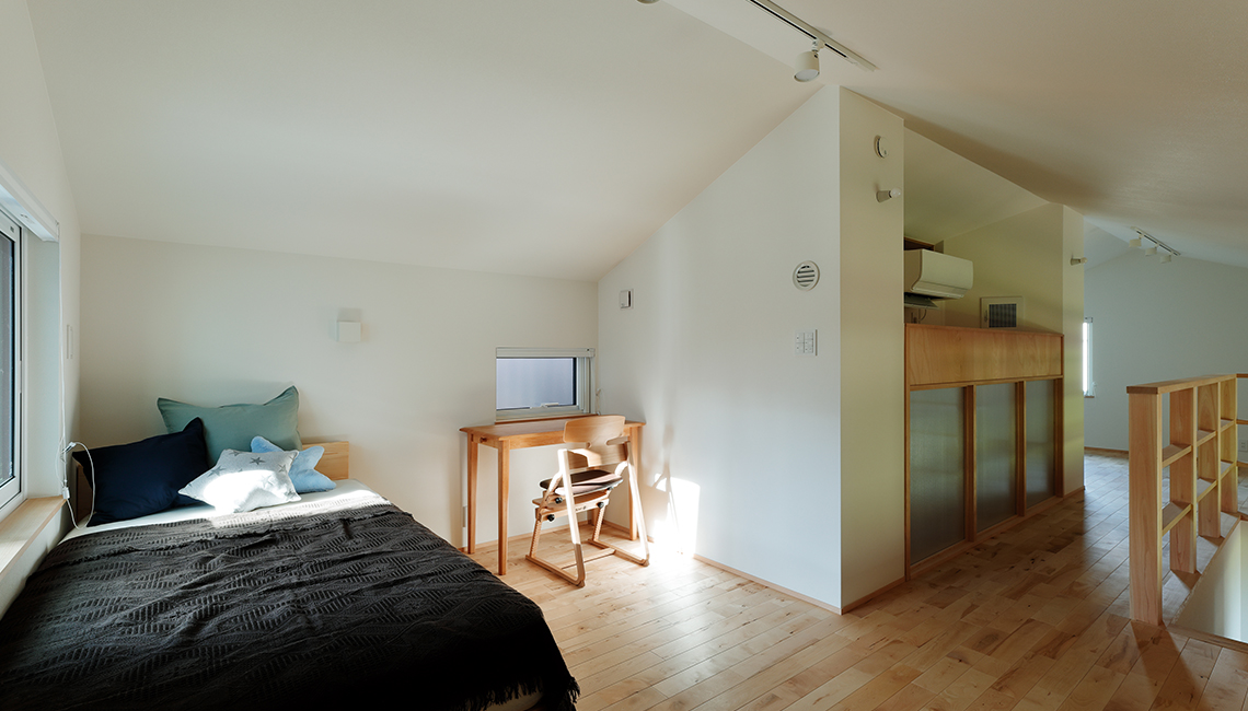 平屋の最大の利点はすべての家事がワンフロアーで完結できること。そんな平屋暮らしの最大のメリットは残しつつ、子ども部屋や客室などのプラスαの機能を2階部分に加えました。夫婦の寝室を1階にすることで、暮らしはすべてを1階で完結。老後も安心して暮らせます。また、WICやランドリースペースなどの暮らしやすい生活動線と計画された収納によって家事時短を実現。忙しい1日の中でもほっとできる時間が生まれます。
