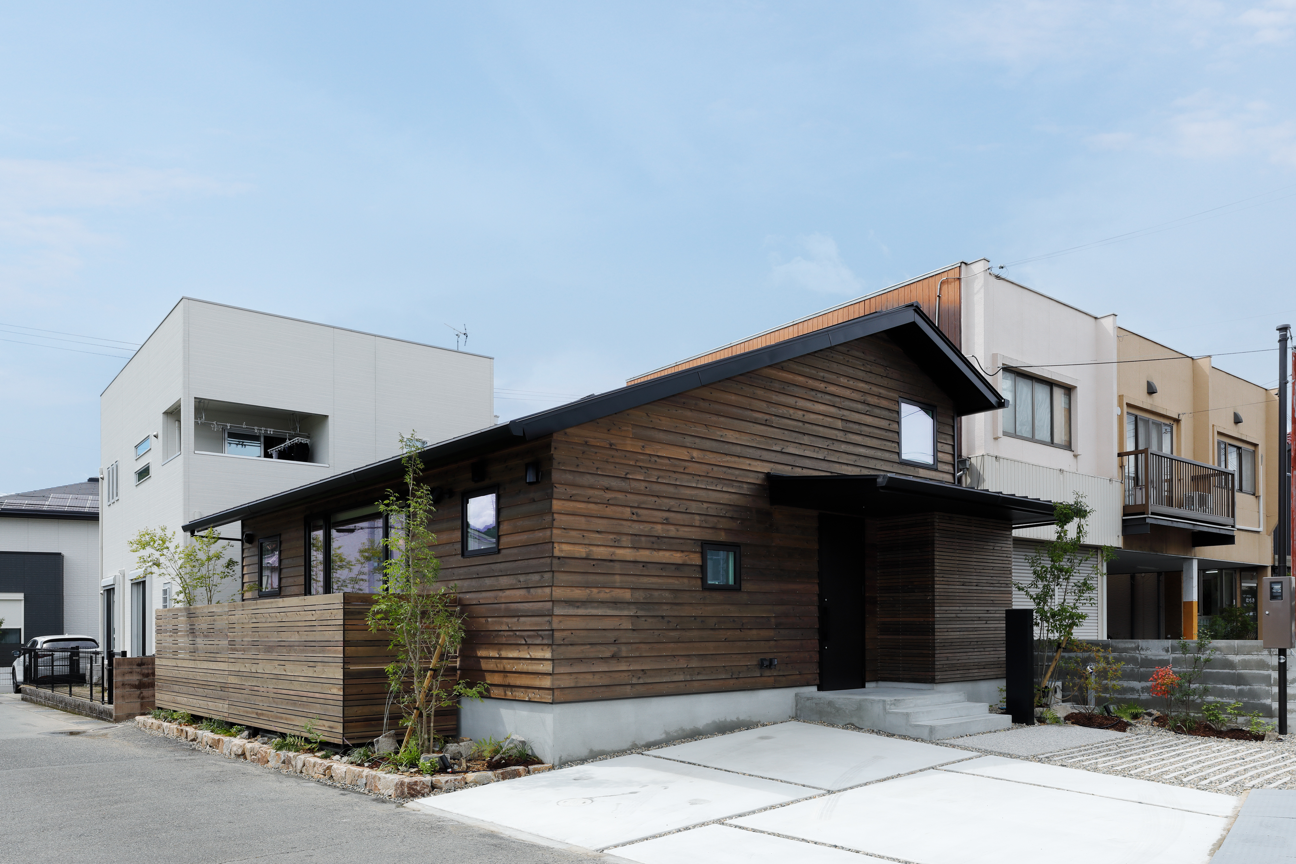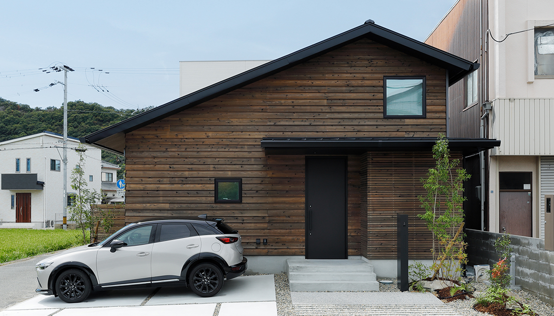外壁は杉板の鎧張りを採用。南面からみると完全な平屋に見えます。