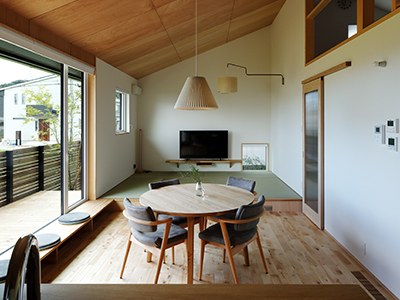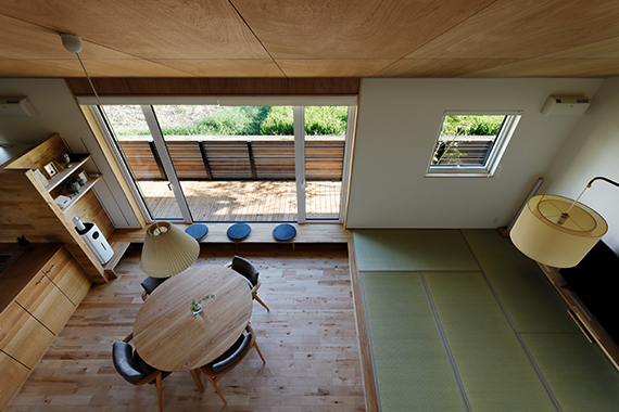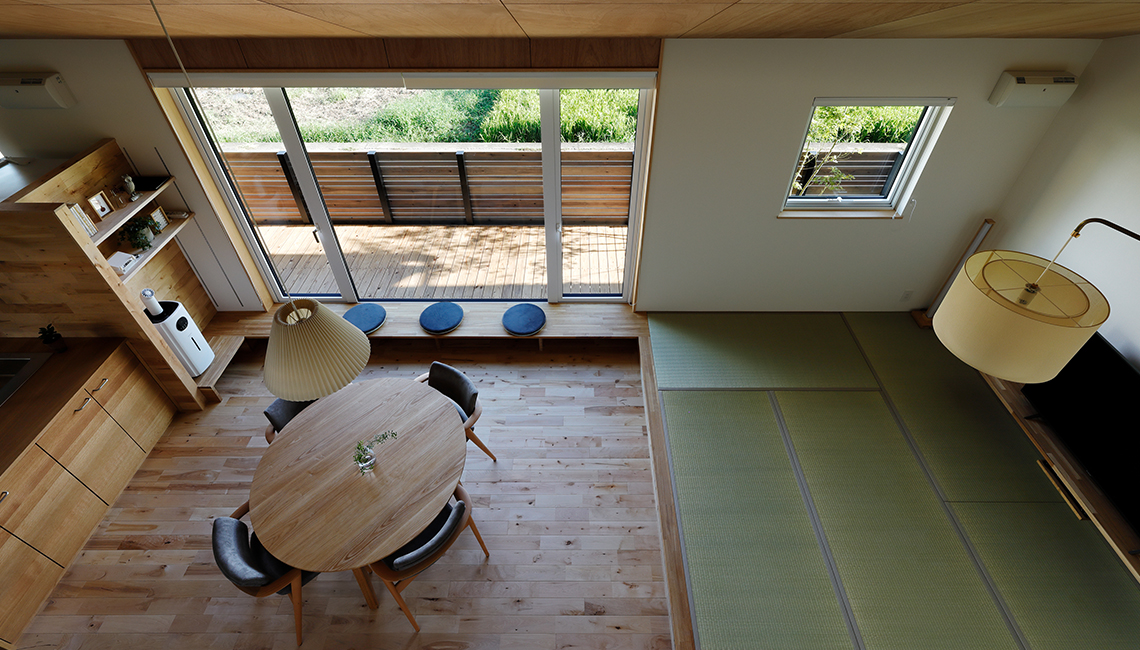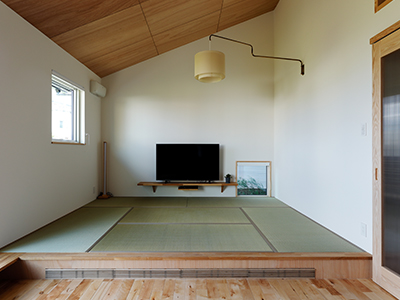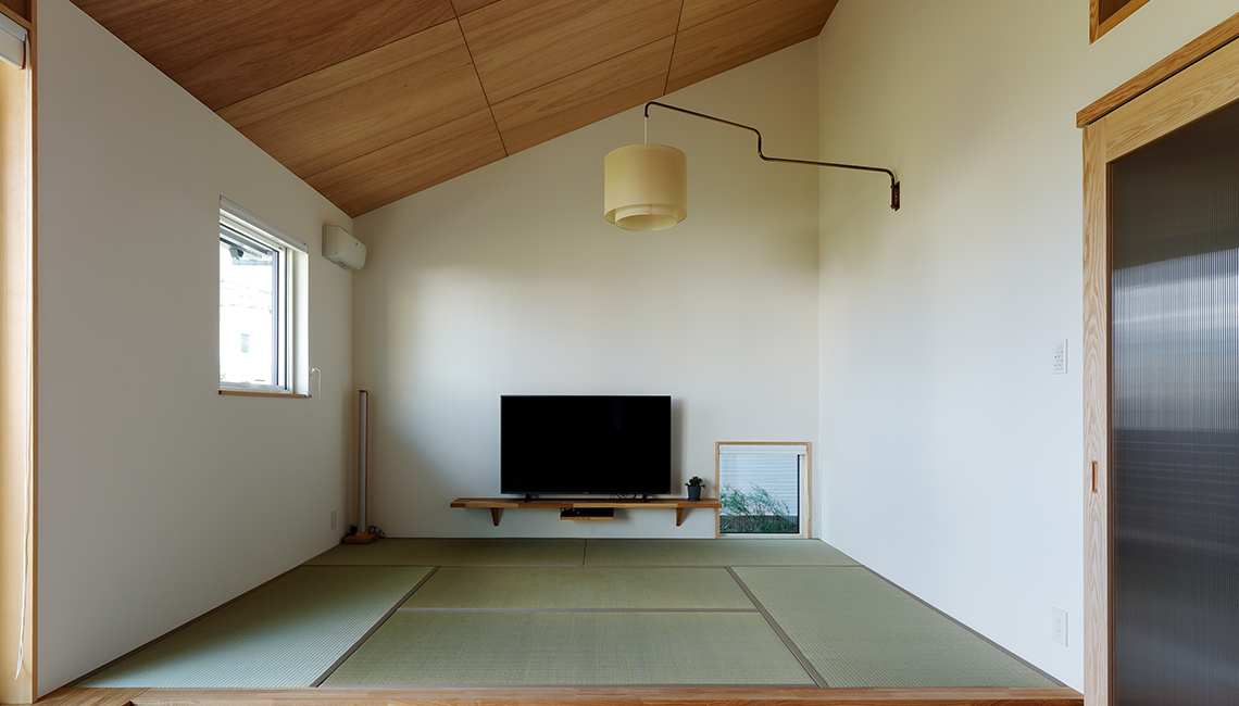 藁畳の柔らかさとイグサの香りが気持ちの良い畳リビング。