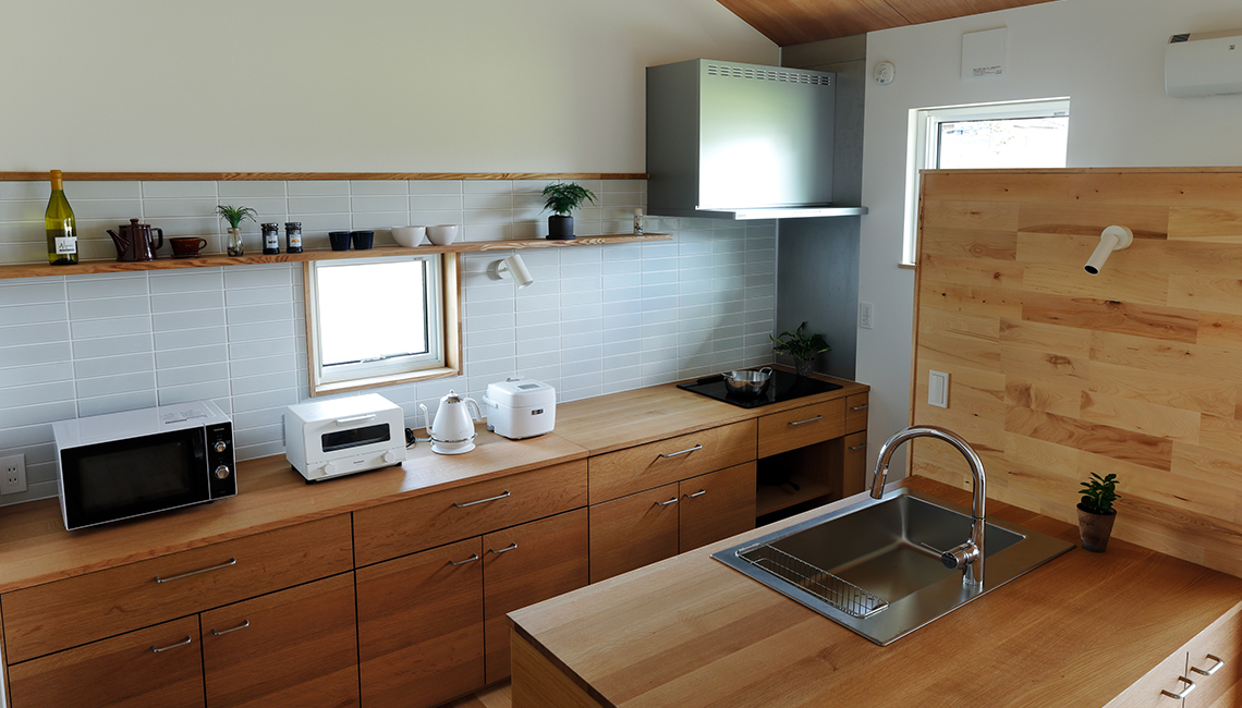 ホワイトオークで造作したキッチン。作業スペースが広く取れるⅡ型を採用しました。
