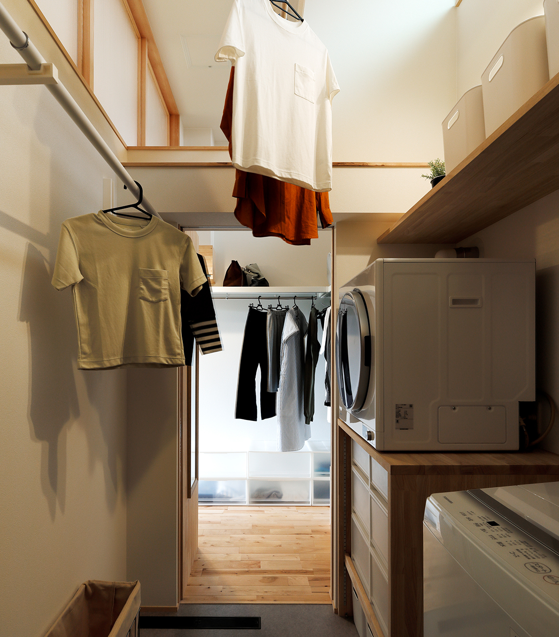明かり窓のあるサニタリーは空間を縦に活用することで洗濯物を干すスペースを確保。