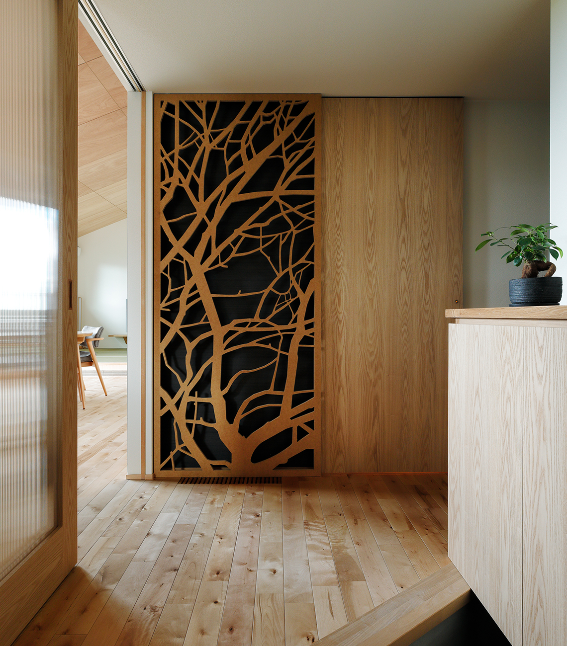 内装 | 居室:ハニカムスクリーン 建具:制作建具 床:無垢材 天井:ラワン合板+クロス貼り 照明:ALL LED |