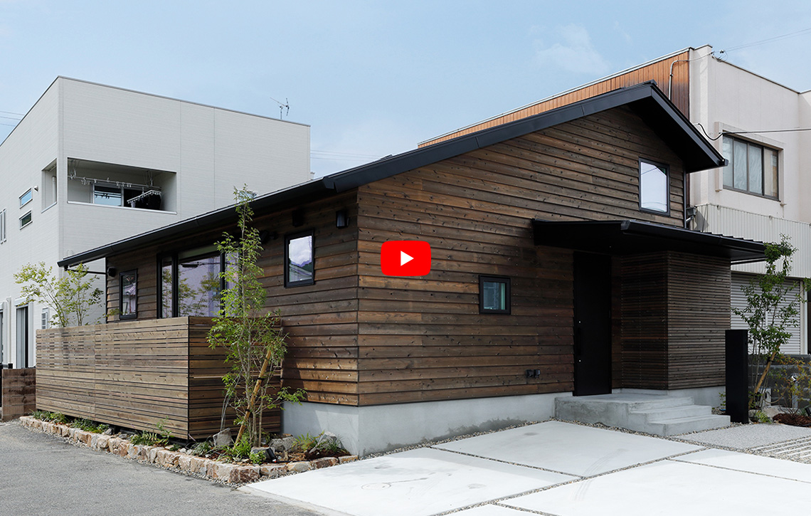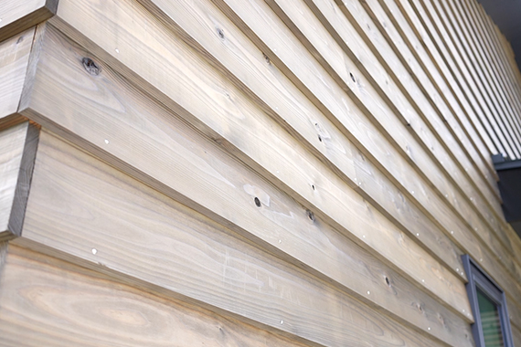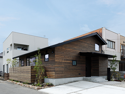 外装材 | 北・西面:ガルバリウム鋼板張り 南・東面:杉板(ウッドロングエコ塗装)鎧張り 東面一部:杉板(ウッドロングエコ塗装)ファサードラタン張り |