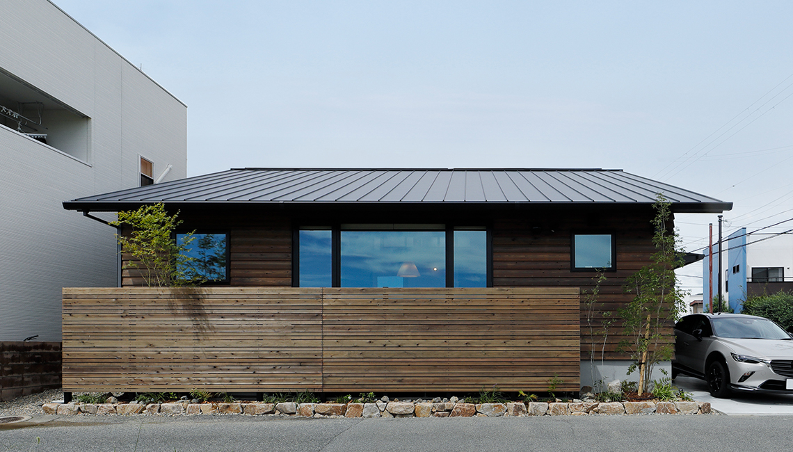 外壁は杉板の鎧張りを採用。南面からみると完全な平屋に見えます。