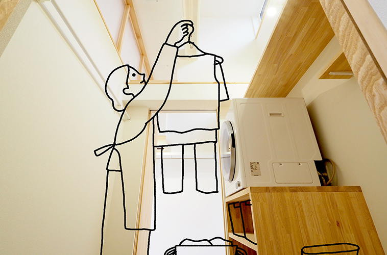 明かり窓のあるサニタリーは空間を縦に活用することで洗濯物を干すスペースを確保。