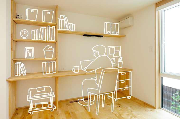 1階にある夫婦の主寝室には2m60㎝のカウンターを設置。書斎としても使えます。