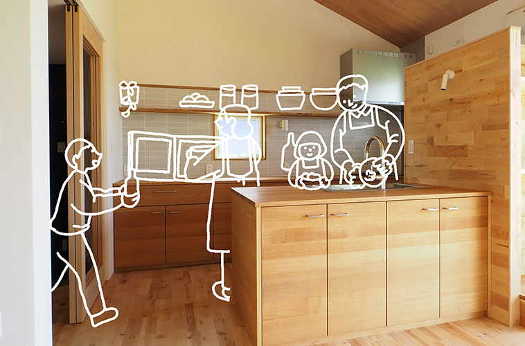 ホワイトオークで造作したキッチン。作業スペースが広く取れるⅡ型を採用しました。