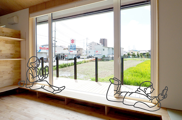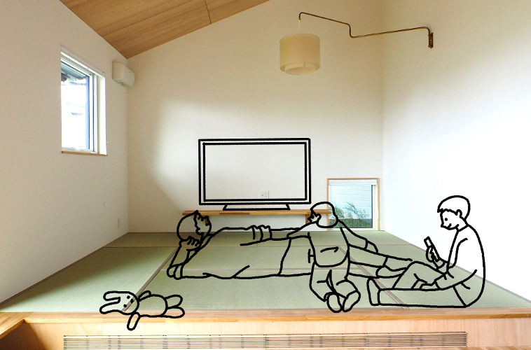 藁畳の柔らかさとイグサの香りが気持ちの良い畳リビング。
