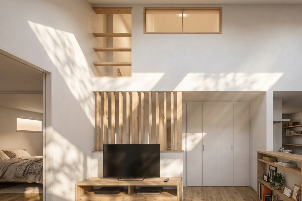 一階でゆったりと寛ぎ、2階では自分の時間を愉しむ。平屋のようにワンフロアで完結する暮らしと、「ほぼ平屋」だからこそ保てる、お互いのちょうどいい距離感。