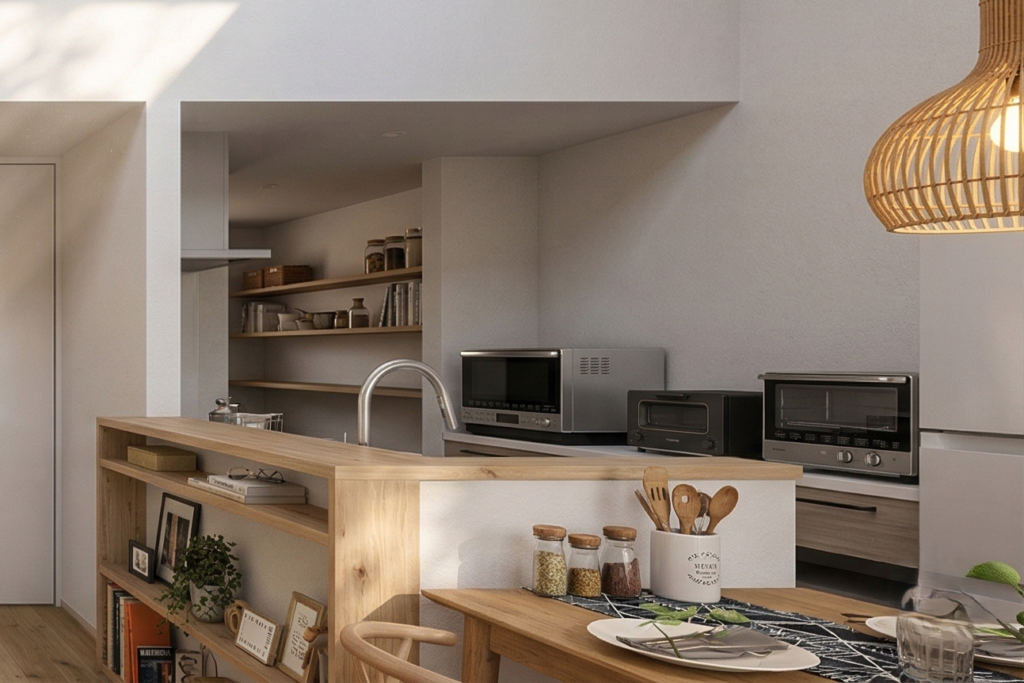 ジャム作りのために、瓶のストックや調理器具もゆったり収まる大容量パントリーを設計しました。キッチン横に広めの収納があることで、カウンターはいつもスッキリ。