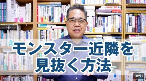 今日は、「土地を探して家を買おう」とか「中古住宅を含めて不動産を買おう」という時に、よくある心配ごとのひとつ、「買ったはいいけれど、近隣に変な人がいたらどうしよう…」という不安についてお話ししたいと思います。実は、うちのお客さんのご友人が土地を買って家を建てられたんですが、完成してしばらくした頃に、近隣にとても困った人がいて、本当に悩まれてしまったそうなんです。それを聞かれたお客さんが、「事前に分かる方法はないですか?」と質問をくださって。絶対に大丈夫、という方法はないんですけど、ある程度リスクを減らすことはできると思うんです。題して「土地を買う前に知っておく モンスター近隣を見抜く方法」。ではいつものように、僕の板書を見ながら聞いてもらえたらと思います。