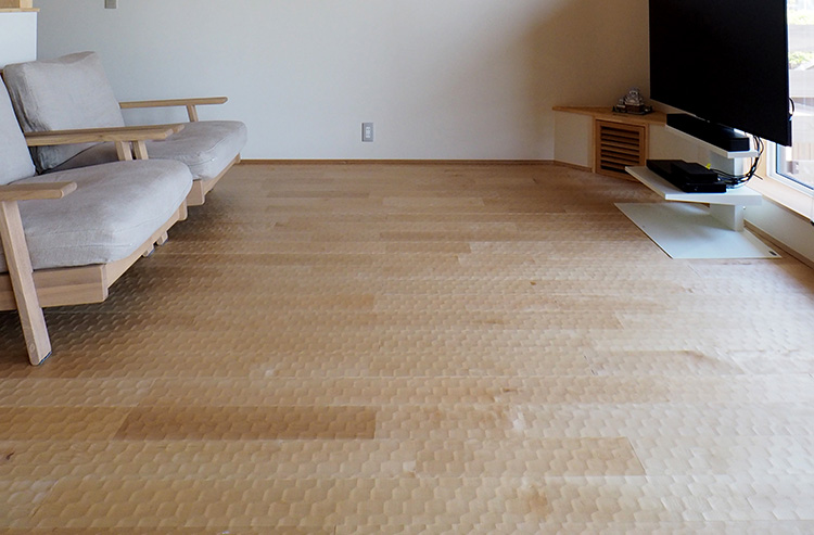 名栗加工を採用して本当に良かったです。2階だけでなく1階の床まで全部したかったと思うぐらい気に入っています。遊びに来た子どもの友人も「気持ちいい~」と言いながら凹凸が施された床の上に寝そべったりして、とても好評です。誰が来ても「すごく良いね」と言われます。