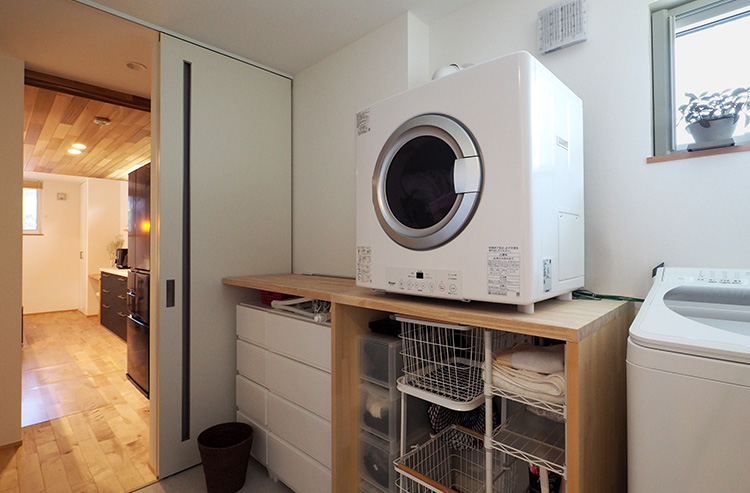 実際、新しい家では家事の効率がとても良くなりましたね。以前は洗濯物を干すにもしまうにも違う場所に持って行かなければなりませんでしたが、今は洗濯機の隣で畳んで、すぐ近くの収納にしまうことができます。また、以前は夜に洗濯して一つ一つハンガーに掛けて干していたので、時間がかかって寝るのが遅くなったりしていましたが、今は乾太くんで乾燥させるので、その手間が省けました。
