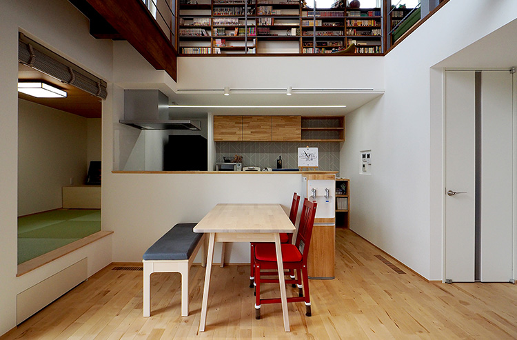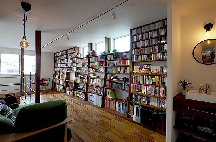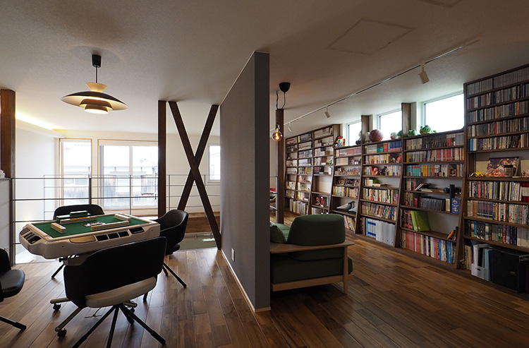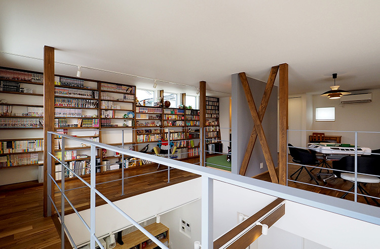 実家に大きな吹き抜けがあって、その環境で育ったので天井があるよりも広くて明るい空間が欲しいなと。だから大きな吹き抜けは絶対に欲しかった。それから読書が好きなので大きい本棚も欲しかったんです。吹き抜けと本棚の両方を叶えてくれるのが第一条件でした。